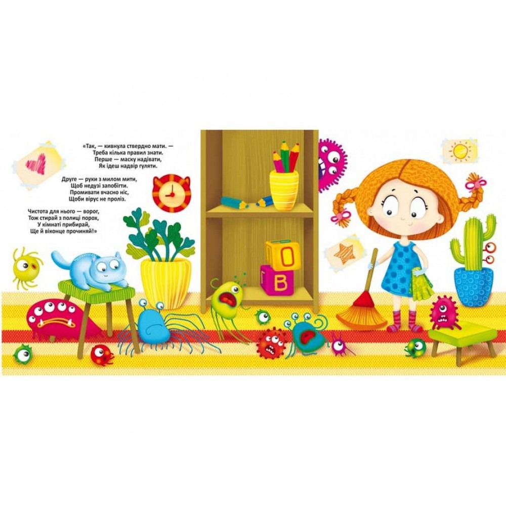 Малюку, ти тримаєш а руках дивовижну багаторазову розмальовку! З нею ти станеш справжнім чарівником. Достатньо провести мокрим пензликом по чистому аркаша, як він перетвориться на яскравий малюнок. Але на цьома дива не закінчаються — дай зображенню повністю висохнати, і воно щезне! Ти можеш повторювати цей фокус знову й знову — наша розмальовка не дасть тобі надьгувати! Шановні батьки! Не біда, якщо дитині ще ватко у вправлятися з олівцями або фарбами, для малювання в цій книжці знадобляться тільки вода та пензлика. А завдяки веселим віршикам ваш малюк дізнається все про те, як захиститися від вірусів