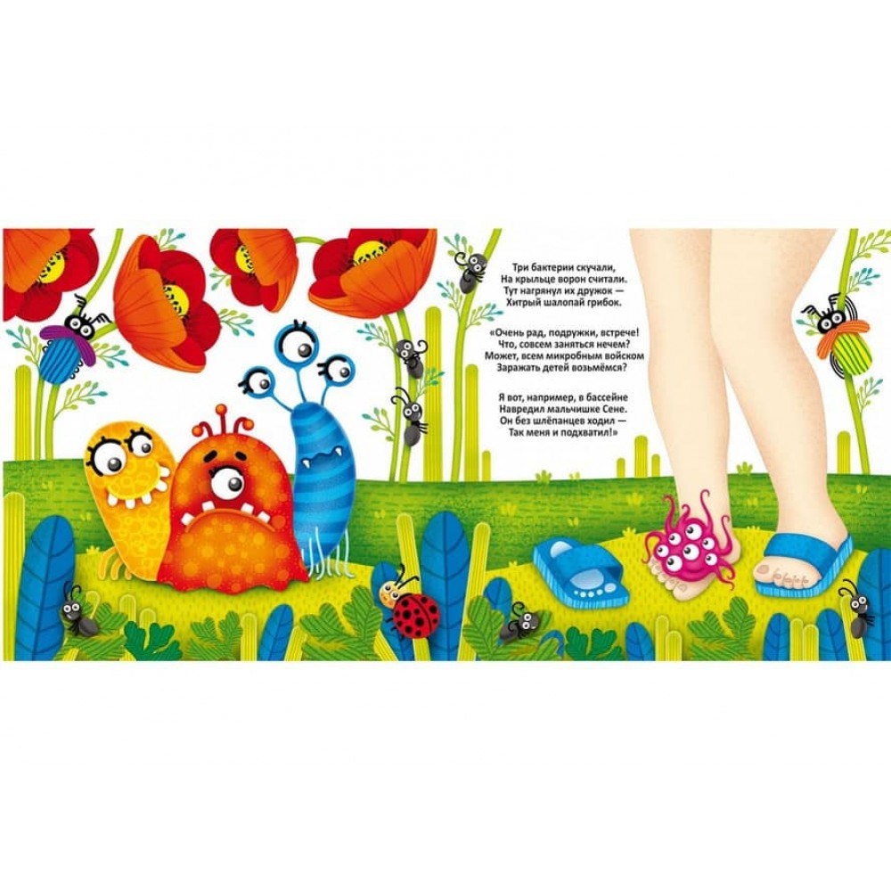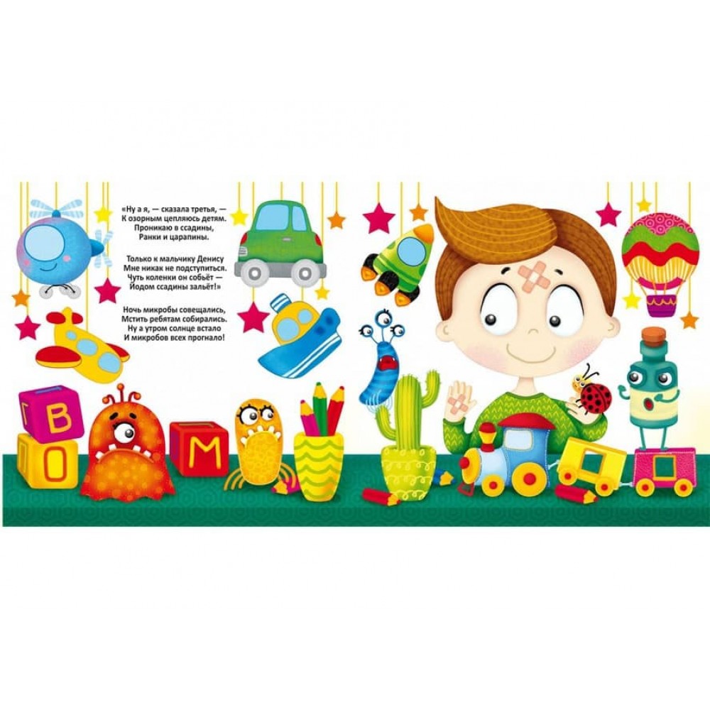 Малюк, ти тримаєш у руках дивовижну багаторазову розмальовку! З нею ти станеш справжнім чарівником! Достатньо провести мокрим пензликом по чистому аркушу, як він перетвориться на яскравий малюнок. Однак на цьому чудеса не закінчуються - дай зображенню повністю висохнути, і воно зникне! Ти можеш повторювати цей фокус знову і знову - з нашою розмальовкою нудьгувати не доведеться! Шановні батьки! Не біда, якщо дитині ще складно вправлятися з олівцями або фарбами, для малювання в цій книжці знадобляться тільки вода і пензлик. А завдяки веселим віршикам ваш малюк дізнається, все про те, як захиститися від мікробів.