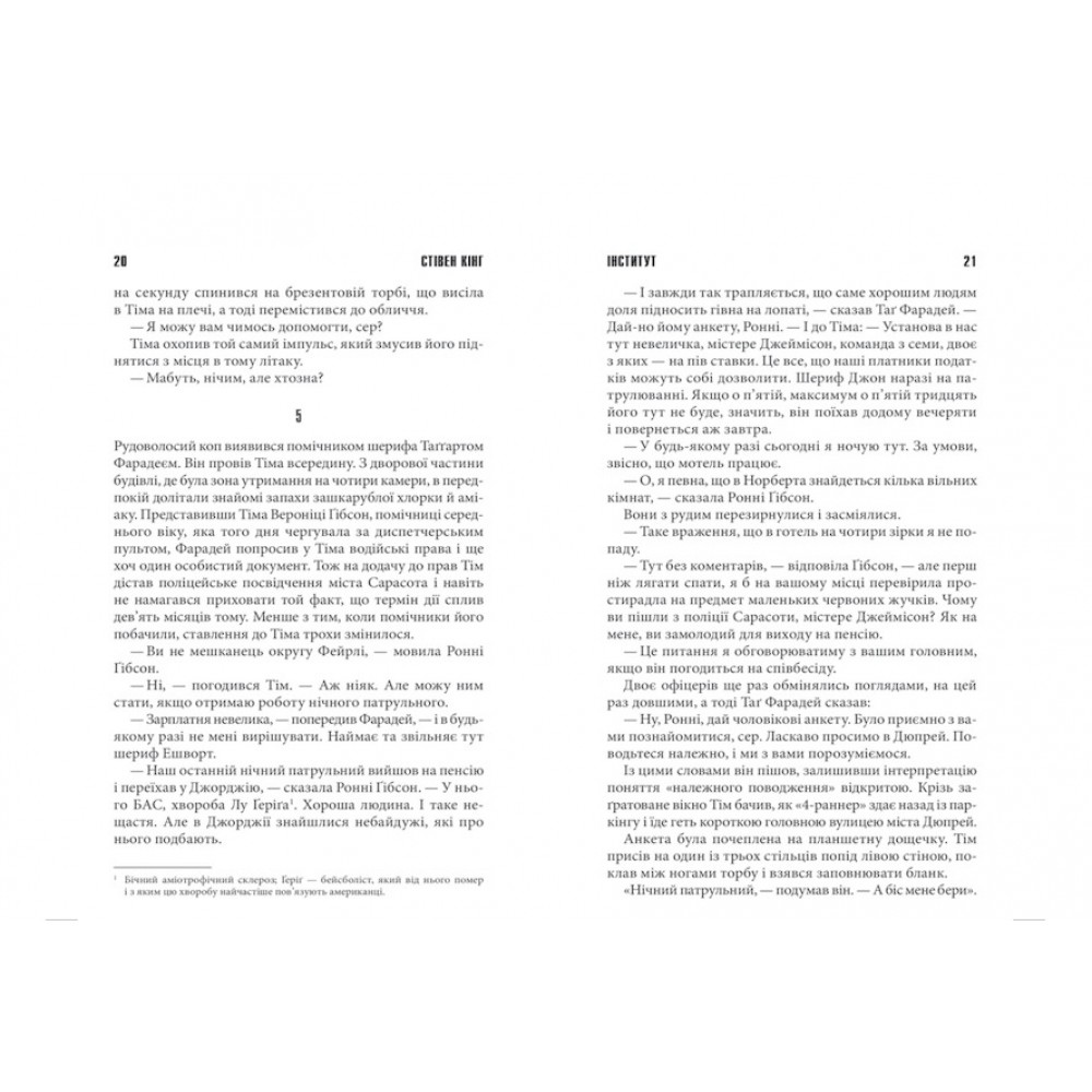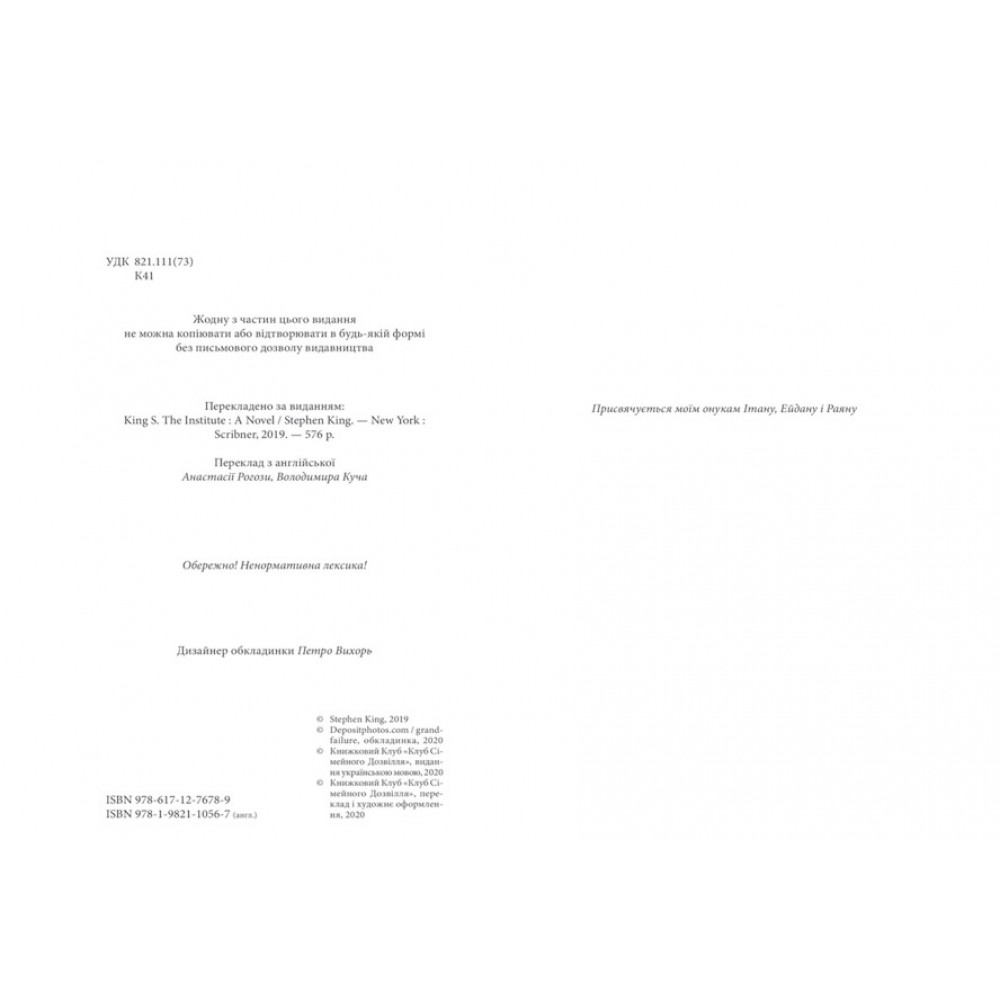 Тієї ночі почався кошмар. Батьків Люка вбили, а самого хлопця закинули в позашляховик та повезли в невідомому напрямку. Він приходить до тями в місці, яке називають Інститутом. Таке собі гетто для дещо... незвичайних дітей. Їх викрадають і тримають тут, наче піддослідних щурів. Директорка місіс Сіґсбі та співробітники цієї зловісної установи безжально «викачують» з дітей їхні телепатичні й телекінетичні здібності. Нова знайома Люка каже, що звідси неможливо втекти. Але він має спробувати...