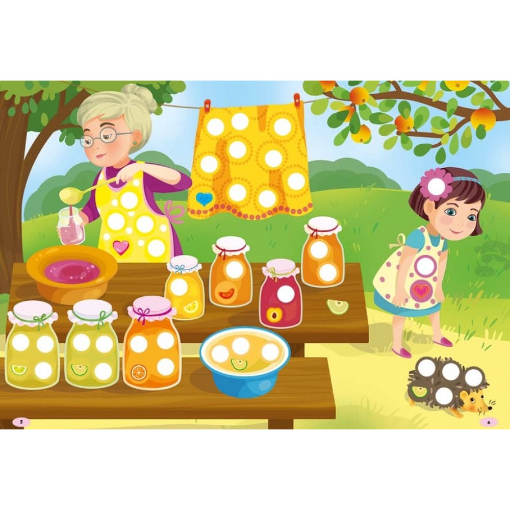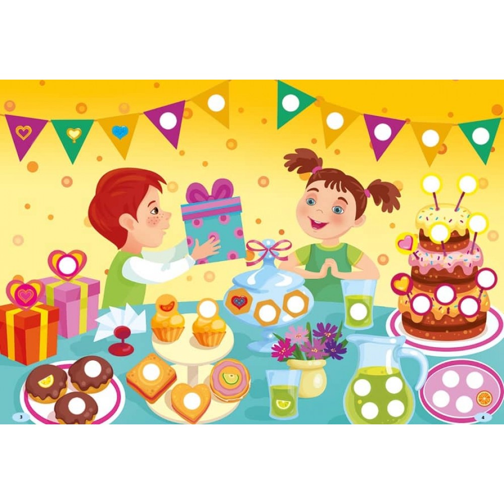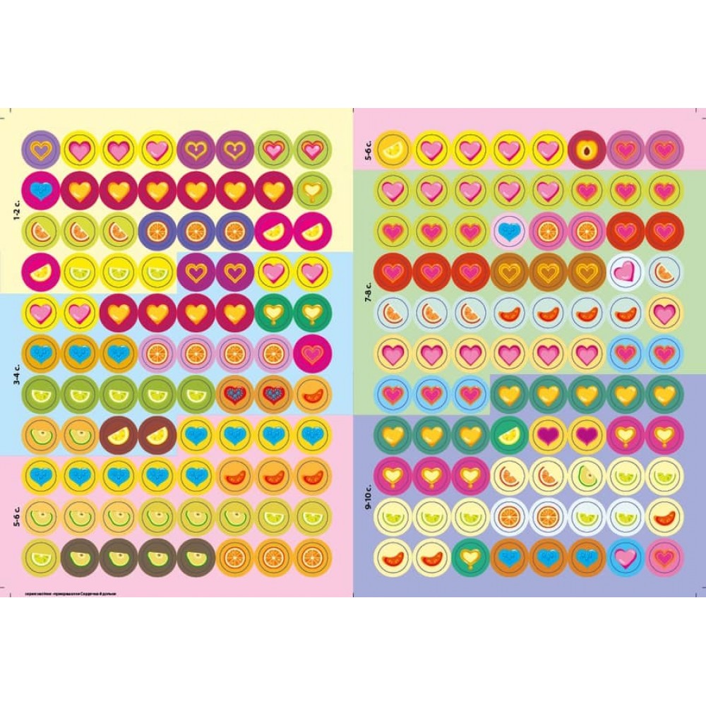 Видання містить 176 наліпок — різнокольорових сердечок і дольок. Дитина має доповнити за їхньою допомогою картинки: вклеїти їх у порожні кружечки за зразком. Колір контура наліпок послугує малюкові підказкою. Робота із цією книжкою сприятиме розвитку в дитини уваги та логіки, дрібної моторики та координації рухів руки, акуратності й творчого мислення.