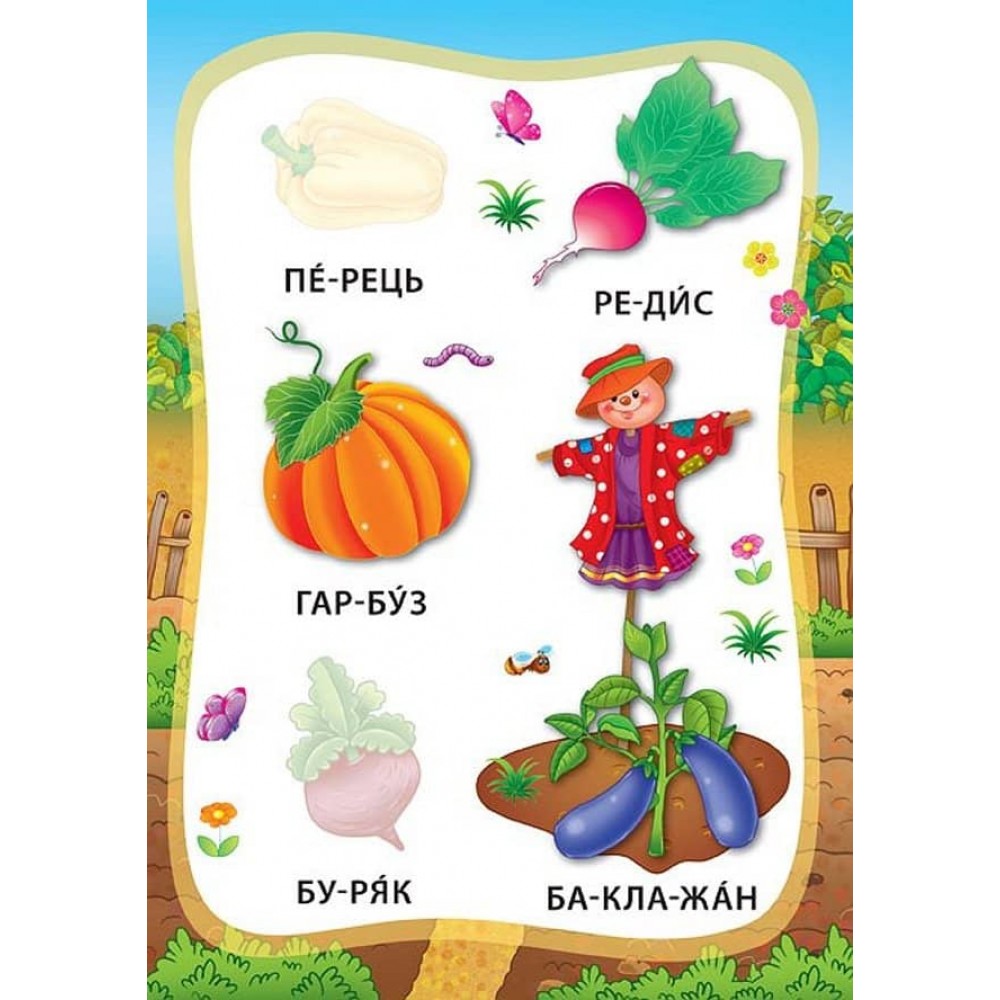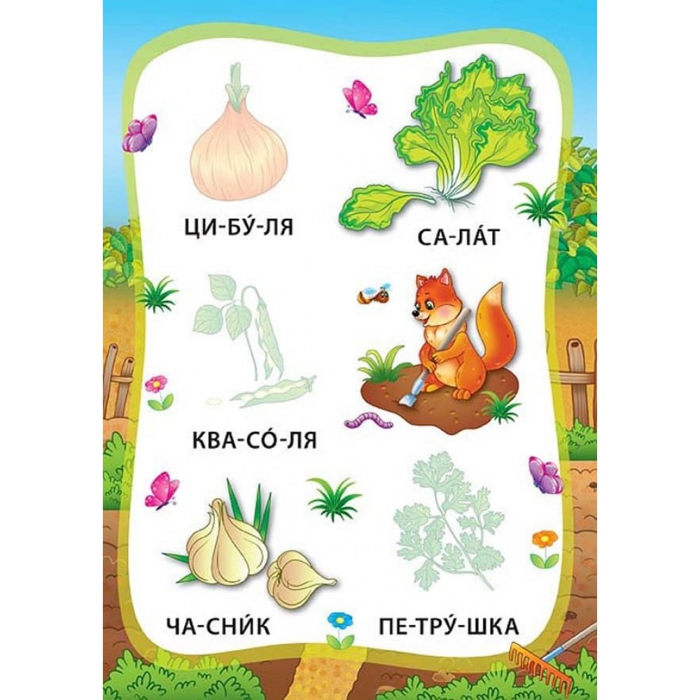 Ця книжка допоможе малюкам навчитися читати по складах і запам’ятати назви овочів та фруктів, розвинути дрібну моторику пальців рук, зорову пам’ять й увагу. Видання містить яскраві ілюстрації, тематичні наліпки й підписи до кожного малюнка. Крім того, слова поділені на склади та надруковані зручними для сприйняття великими літерами. Усе це зробить складний процес читання легким і захопливим.