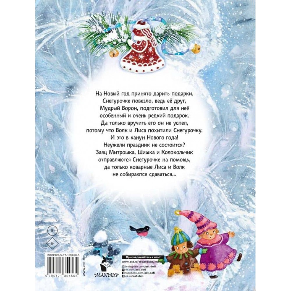 Якщо говорити про книжку, яка занурить читача в атмосферу свята, то ось вона - казка Ірини Токмакової та Софії Прокоф'євої "Подарунок для Снігуроньки, або Що трапилося під Новий рік". Тут усе відбувається за законами казкового жанру: є лиходії, є друзі, і найголовніше, є чарівний сюжет, який талановиті письменниці придумали для юного читача. Снігові краєвиди зимового лісу, красуня Снігуронька, казкові персонажі Мудрий Ворон, заєць Митрошка, Дзвіночок, Шишка та Вітер Панас - усі вони зібралися в цій книжці, щоб наближення Нового року стало для малюка хвилюючим і приємним. Книжка виходить із новими ілюстраціями Анни Юдіної. Для дошкільного віку.
