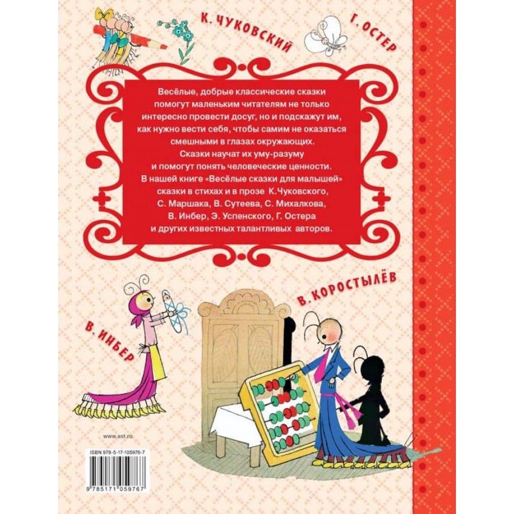 До збірки» веселі казки для малюків " увійшли десять неодноразово екранізованих творів легендарних вітчизняних дитячих письменників. Серед них-» плутанина «і» Мойдодир «Корнія Чуковського,» Пудель «Самуїла Маршака,» Петя і Червона Шапочка «Володимира Сутеева,» як старий корову продавав «Сергія Михалкова,» стоноги «віри Інбер,» про Сидорова Вову «Едуарда Успенського,» Вовка в Тридев'ятому царстві «Вадима Коростильова і» про Иванушку-дурника " в переказі Максима Горького і не тільки.