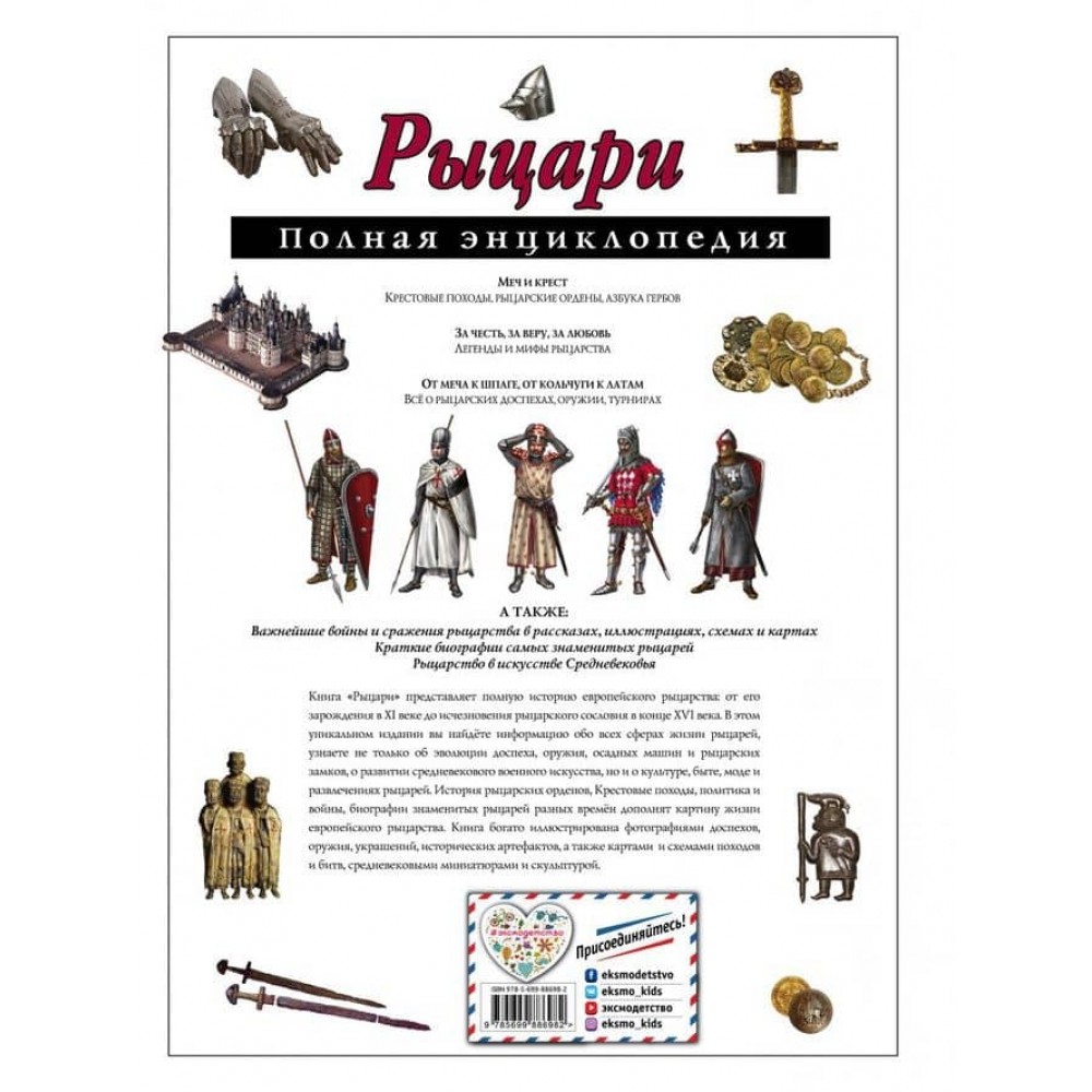 Ця енциклопедія представляє повну історію європейського лицарства - від зародження лицарського стану в ХІ ст. до його зникнення наприкінці ХVІ ст. Це унікальне видання висвітлює різні сторони життя лицарів. Читач дізнається про еволюцію військового мистецтва, обладунків, зброї, облогових машин і замків, познайомиться з культурою, побутом, модою та розвагами лицарів. Книга розповідає про Хрестові походи і лицарські ордени, про середньовічну політику і війни, про королів і героїв лицарської епохи. Текст доповнено чудовими авторськими ілюстраціями. Зручна сучасна форма подачі матеріалу полегшує пошук і засвоєння інформації. Ця книга адресована школярам, студентам і всім любителям історії.