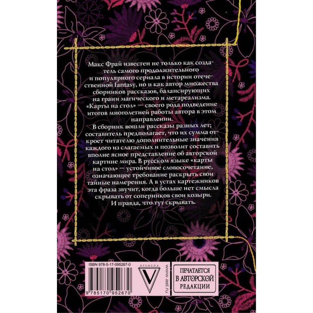 Макс Фрай відомий не тільки як творець найтривалішого і найпопулярнішого серіалу в історії вітчизняної fantasy, а й як автор безлічі збірок оповідань, що балансують на межі магічного і метареалізму. "Карти на стіл" - свого роду підбиття підсумків багаторічної роботи автора в цьому напрямку. До збірки увійшли оповідання різних років; укладач припускає, що їхня сума відкриє читачеві додаткові значення кожного з доданків і дасть змогу скласти цілком чітке уявлення про авторську картину світу. У російській мові "карты на стол" - стійке словосполучення, що означає вимогу розкрити свої таємні наміри. А в устах картярів ця фраза звучить, коли більше немає сенсу приховувати від суперників свої козирі. І справді, що тут приховувати.