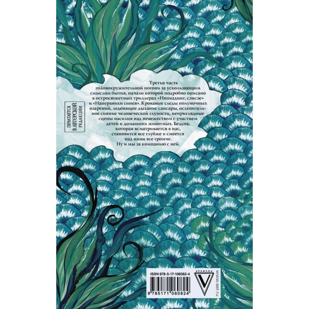 Третя частина запаморочливої гонитви за сенсом буття, що вислизає, початок якої докладно описаний у гостросюжетних трилерах "Няпіzдінг сенсеє" і "Наперсники синіючи". Криваві сліди опівнічних осяянь, льодовий подих сансари, сліпуче сяйво людської дурості, непривабливі сцени насильства над невіглаством за участю дітей і домашніх тварин. Безодня, яка вдивляється в нас, стає дедалі глибшою і сміється над нами дедалі голосніше. Ну і ми за компанію з нею.