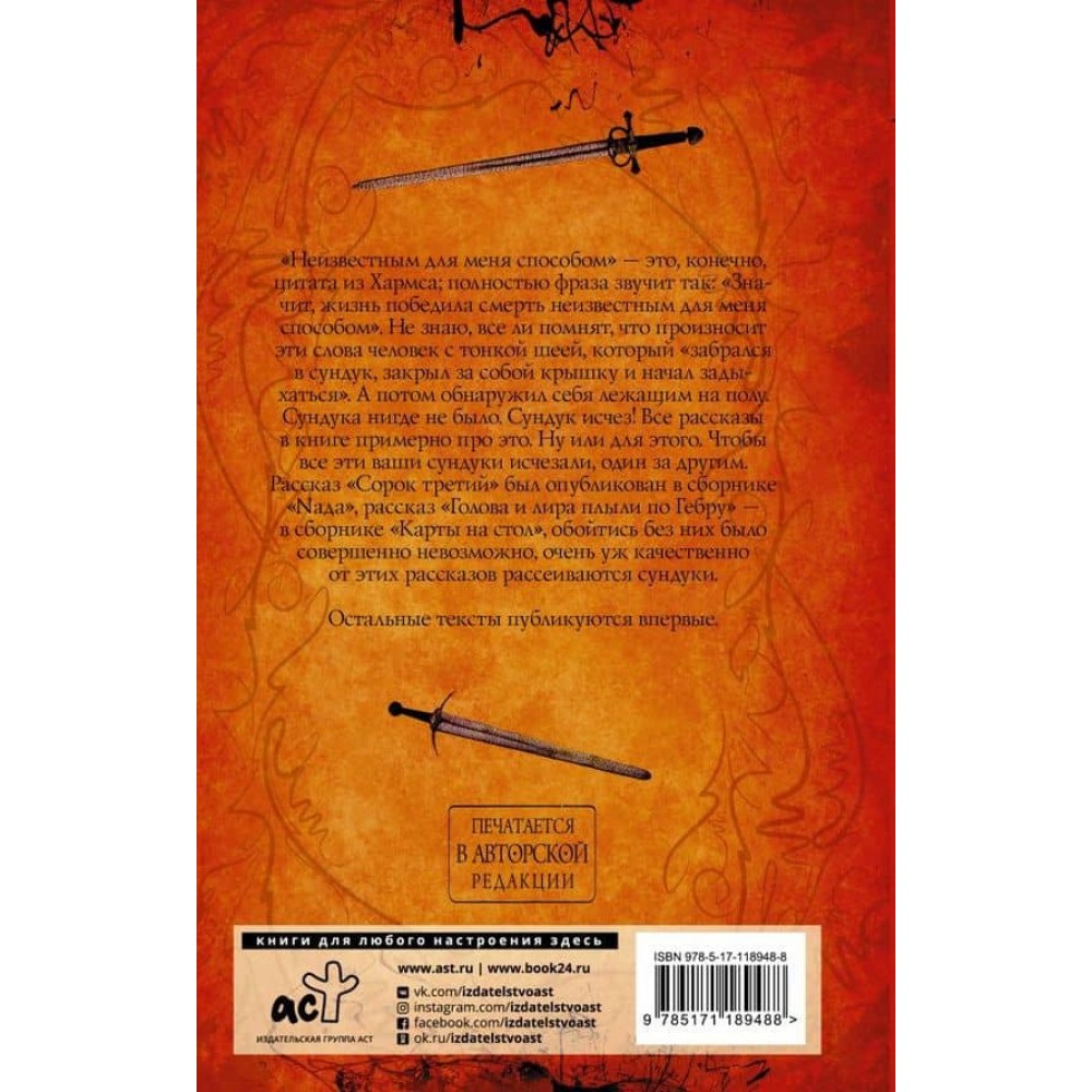 Уявіть собі людину, яка спочатку сама, за власним бажанням залазить до скрині та зачиняє кришку. А потім починає в цій скрині задихатися. І коли напад клаустрофобії доводить її до повного виснаження, вона раптом розплющує очі й розуміє: скрині ж немає! Вона зникла, і людина просто лежить на підлозі. Усі розповіді в книзі приблизно про це. Ну або для цього. Щоб усі ці ваші скрині зникали, одна за одною. Оповідання "Сорок третє" було опубліковано у збірці "Nада", оповідання "Голова і ліра пливли по Гебру" - у збірці "Карти на стіл", обійтися без них було абсолютно неможливо, дуже вже якісно від цих оповідань розсіюються скрині.