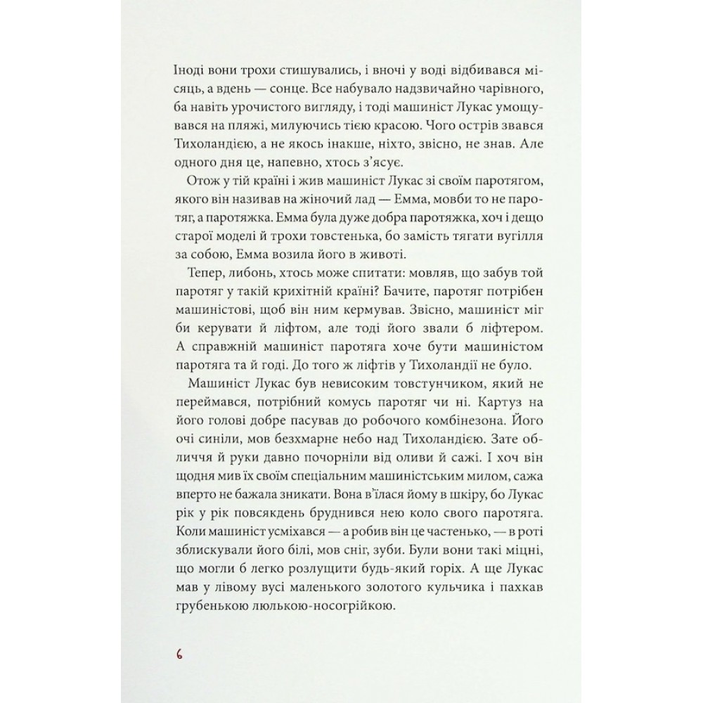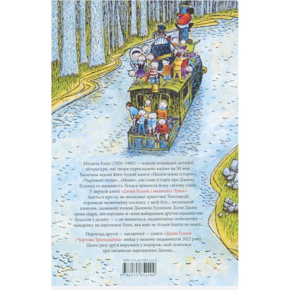 У книзі «Джим Ґудзик і машиніст Лукас» йдеться про те, як мешканці крихітної Тихоландії отримали незвичайну посилку, у якій був... маленький хлопчик, названий згодом Джимом Ґудзиком. Коли Джим трохи підріс, він вирушив зі своїм найкращим другом машиністом Лукасом у далеку — і, як виявиться, надзвичайно небезпечну — мандрівку на паротяжці Еммі, яка вміє не тільки їздити по землі...