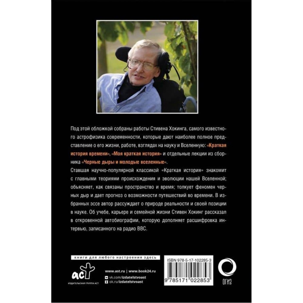 Під цією обкладинкою зібрано праці Стівена Гокінга, найвідомішого астрофізика сучасності, що дають найповніше уявлення про його життя, роботу, погляди на науку та Всесвіт: "Коротка історія часу", "Моя коротка історія" та окремі лекції зі збірки "Чорні діри та молоді всесвіти". "Коротка історія", що стала науково-популярною класикою, знайомить із головними теоріями походження та еволюції нашого Всесвіту; пояснює, як пов'язані простір і час; тлумачить феномен чорних дір і дає прогноз про можливість подорожей у часі. В обраних есеях автор розмірковує про природу] реальності та свою позицію в науці. Про навчання, кар'єру та сімейне життя Стівен Гокінг розповів у відвертій автобіографії, яку доповнює розшифровка інтерв'ю, записаного на радіо BBC.