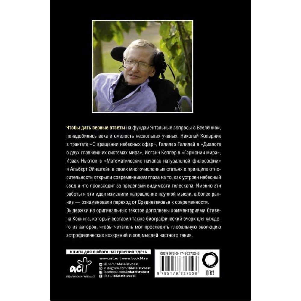 "Перед нами - дуже захоплива історія, адже і Коперник, і Ейнштейн докорінно змінили наші уявлення про порядок речей. Ми розпрощалися зі своїм привілейованим становищем у центрі Всесвіту, з вічністю і незмінністю, навіть з Абсолютним Простором і Часом"... Розвиток науки - це безперервний процес відкриттів. І для того, щоб зрозуміти явища сучасності, необхідно знати, що про них думали великі вчені минулого. Легендарний фізик Стівен Гокінг у науково-популярній книзі "На плечах гігантів" розповів про видатних попередників і забезпечив витяги з їхніх основних праць власними коментарями.