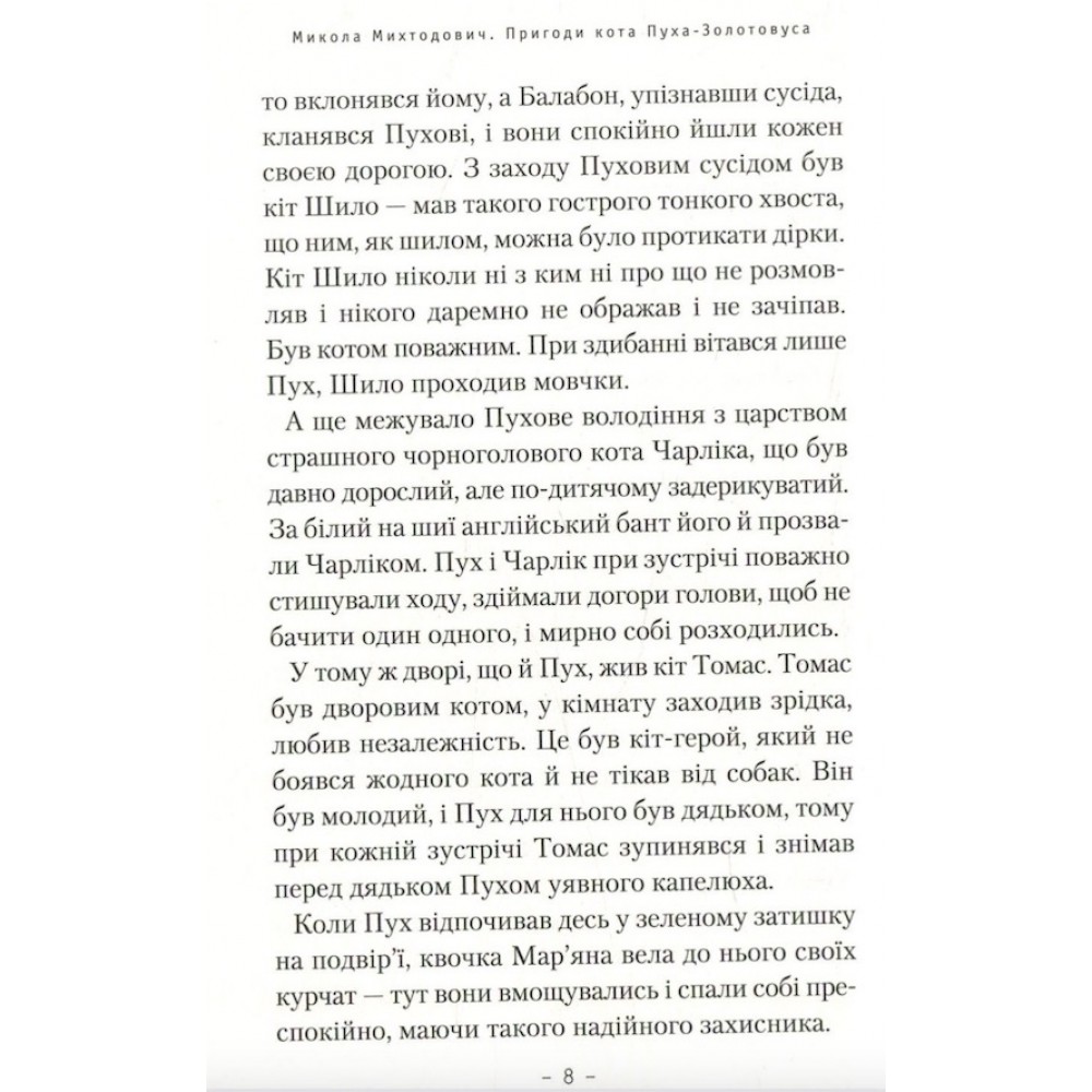 Мабуть, ви читали чимало казок про пригоди котів. Але ця — особлива. Такої незвичної за вигадкою, чистої і піднесеної, як наївне малярство, повісті ви ще не читали. Її мова сповнена якогось щемливого і, сказати б, глибинно українського внутрішнього ритму.