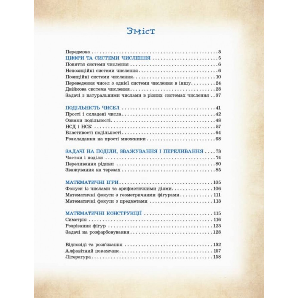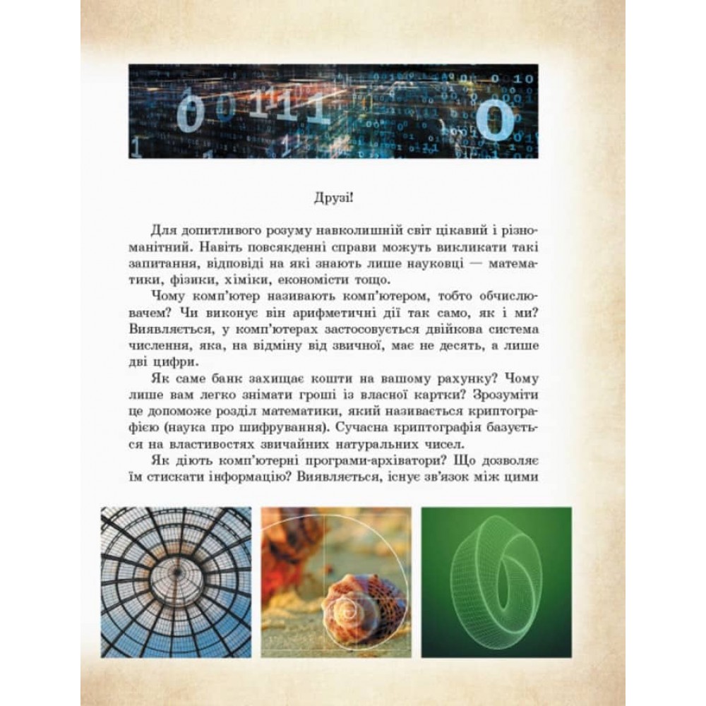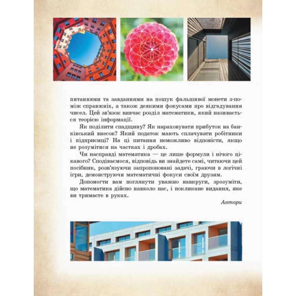 Видання покликане допомогти читачеві поглянути уважно навкруги, зрозуміти, що математика дійсно навколо нас. У посібнику запропоновано логічні задачі, математичні ігри й фокуси, подано необхідні теоретичні відомості, наведено цікаві факти з історії математики.