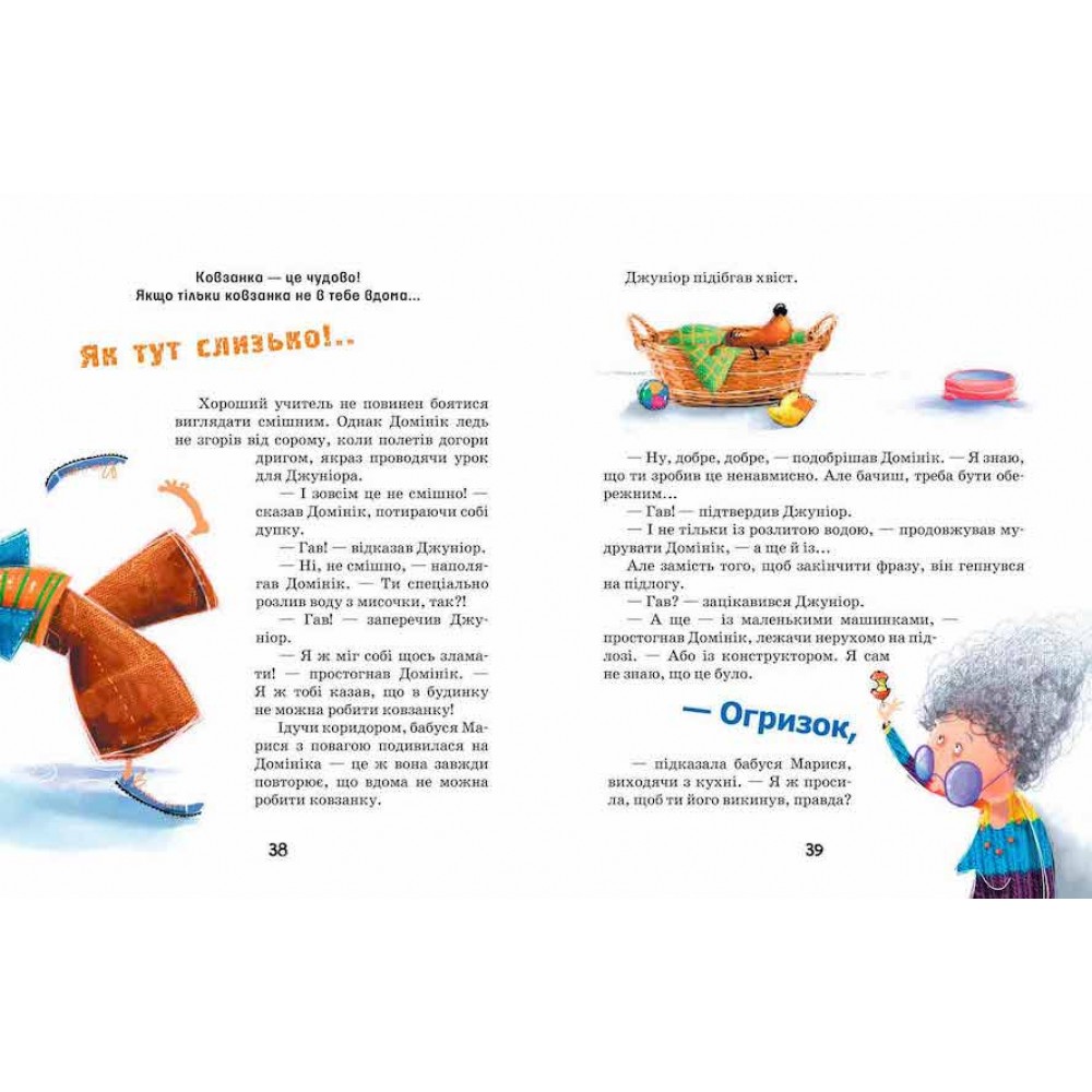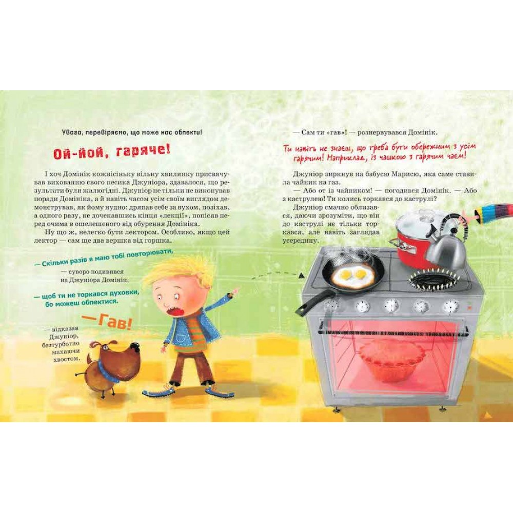 У Домініка є дуже сумлінний учень — його песик Джуніор, якому хлопчик проводить уроки про хатні небезпеки: навчає не совати пальці між одвірком, уникати гострих предметів, бути обачним з електроприладами, застерігає обережно поводитися з гарячим, гострим, важким — усім, що може загрожувати маленьким собачкам і дітлахам! А добра і терпляча бабуся пояснить онуку і читачам книги, чому ті чи інші дії на кухні, у ванній або спальні можуть бути небезпечними.