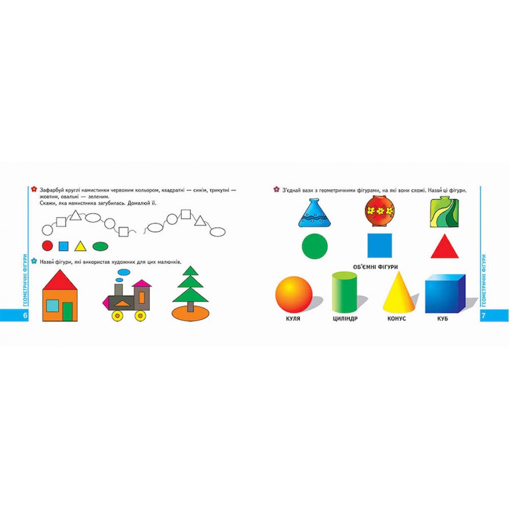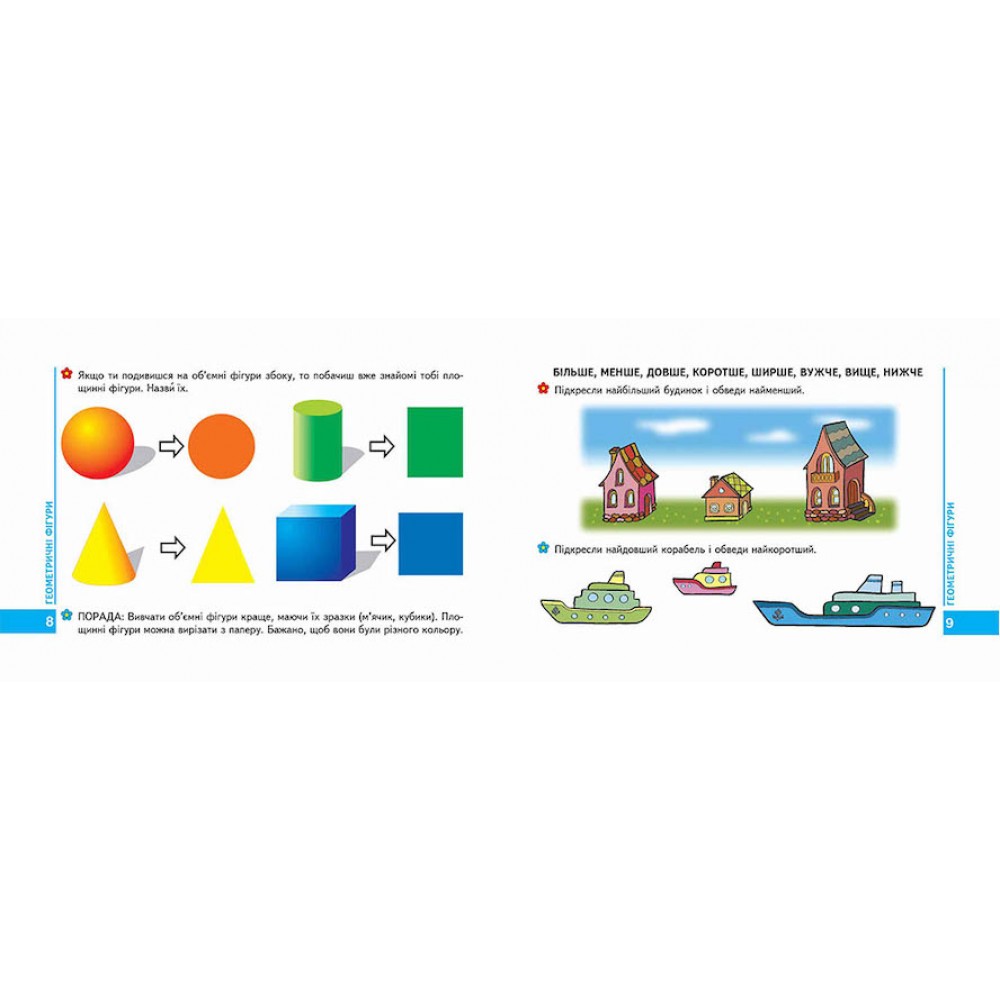 Спочатку є вступне слово до батьків, а до кожного завдання є коментар для батьків чи детальне пояснення для самих малюків. На зворотньому боці обкладинки наведені відомості про геометричні фігури, як площинні, так і об’ємні.
