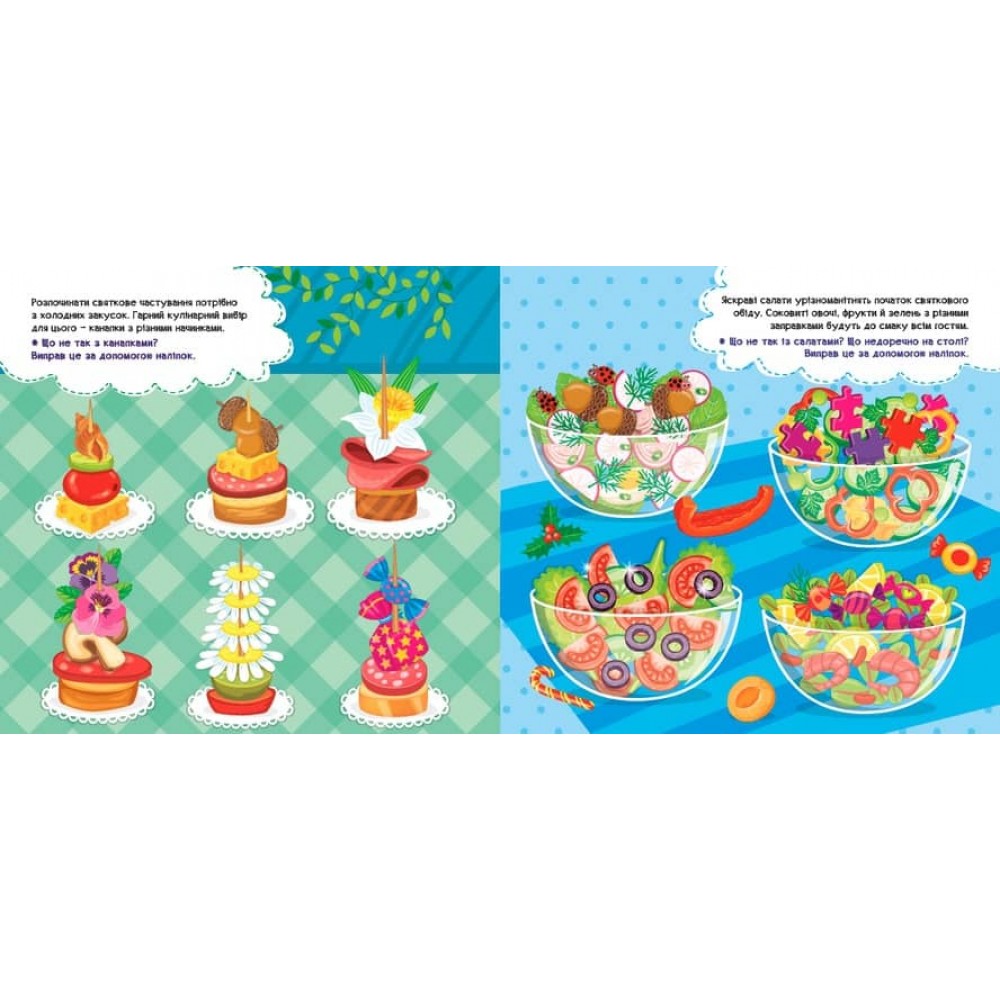 Ця книжка допоможе дітям улаштувати святковий обід: сервірувати стіл і прикрасити його квітковою композицією, приготувати канапки й салати, подати супи та запечену курятину, а також почастувати гостей сирами, фруктами й десертами. Захопливі завдання допоможуть розвинути увагу, логічне мислення, уяву та мовлення, а оригінальне оформлення у вигляді смішної плутанини неодмінно зацікавить дитину. Видання сприятиме розвитку уваги, логічного мислення, уяви та мовлення, а також дозволить весело й пізнавально провести час.