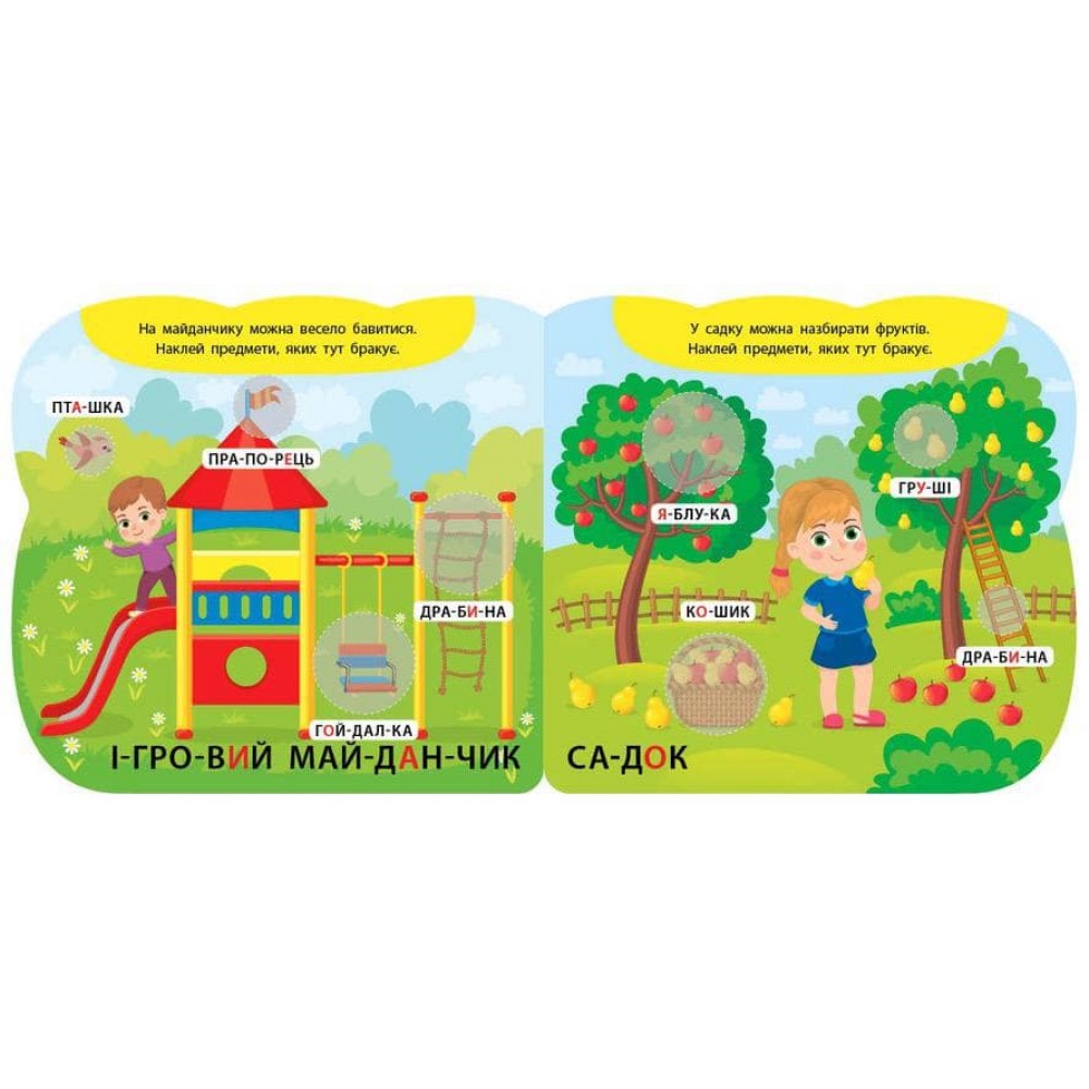 Ця книжка допоможе малюкам краще познайомитися з місцями для прогулянок. На її сторінках містяться малюнки різних локацій, які потрібно доповнити відповідними тематичними наліпками. Місця для них спеціально виділені, щоб малюку було легше орієнтуватися на сторінці. Також малята зможуть прочитати по складах свої перші слова, що сприятиме розвитку їхнього мовлення та цікавішій роботі з книжкою. Видання призначене для спільної роботи дорослих з дітьми від чотирьох років.