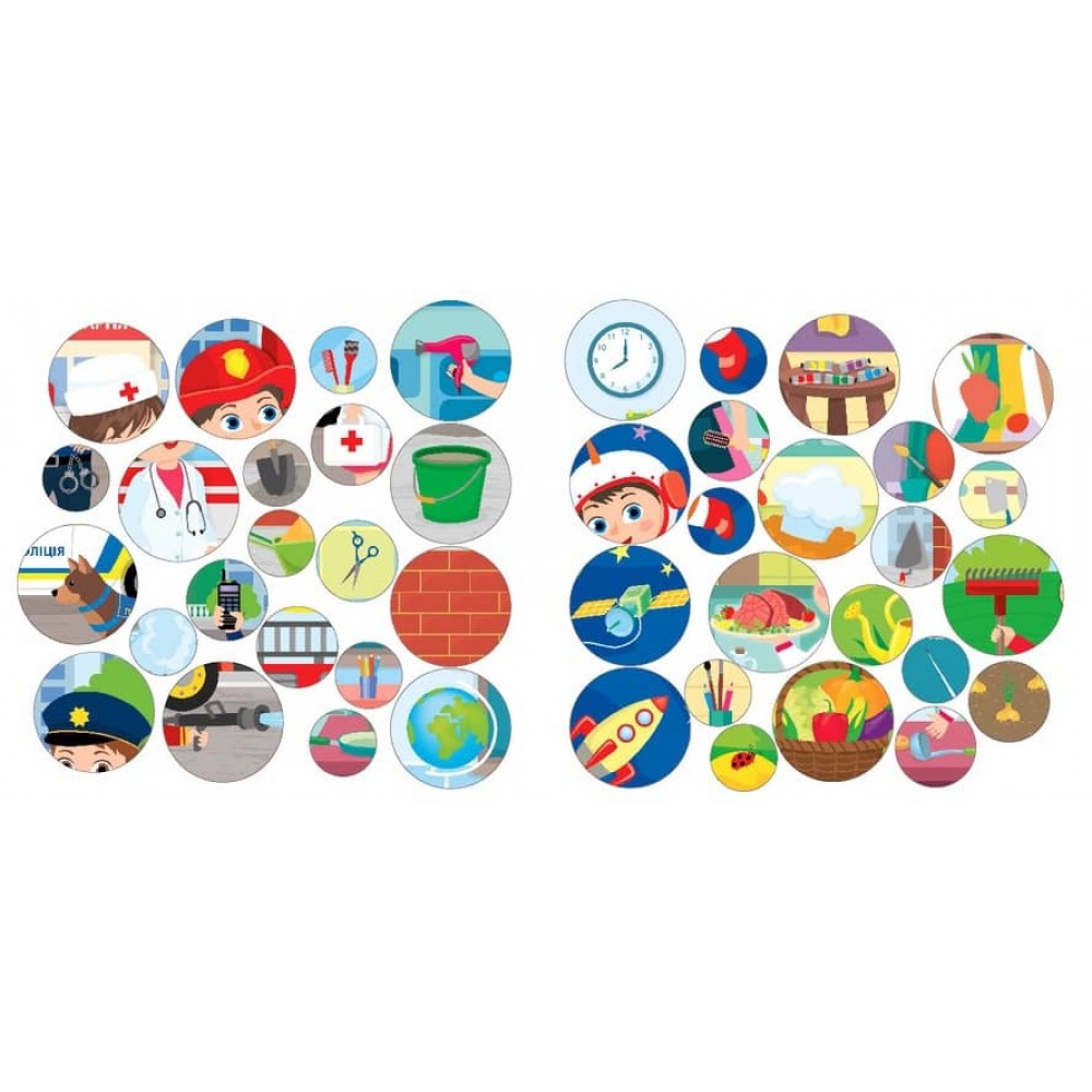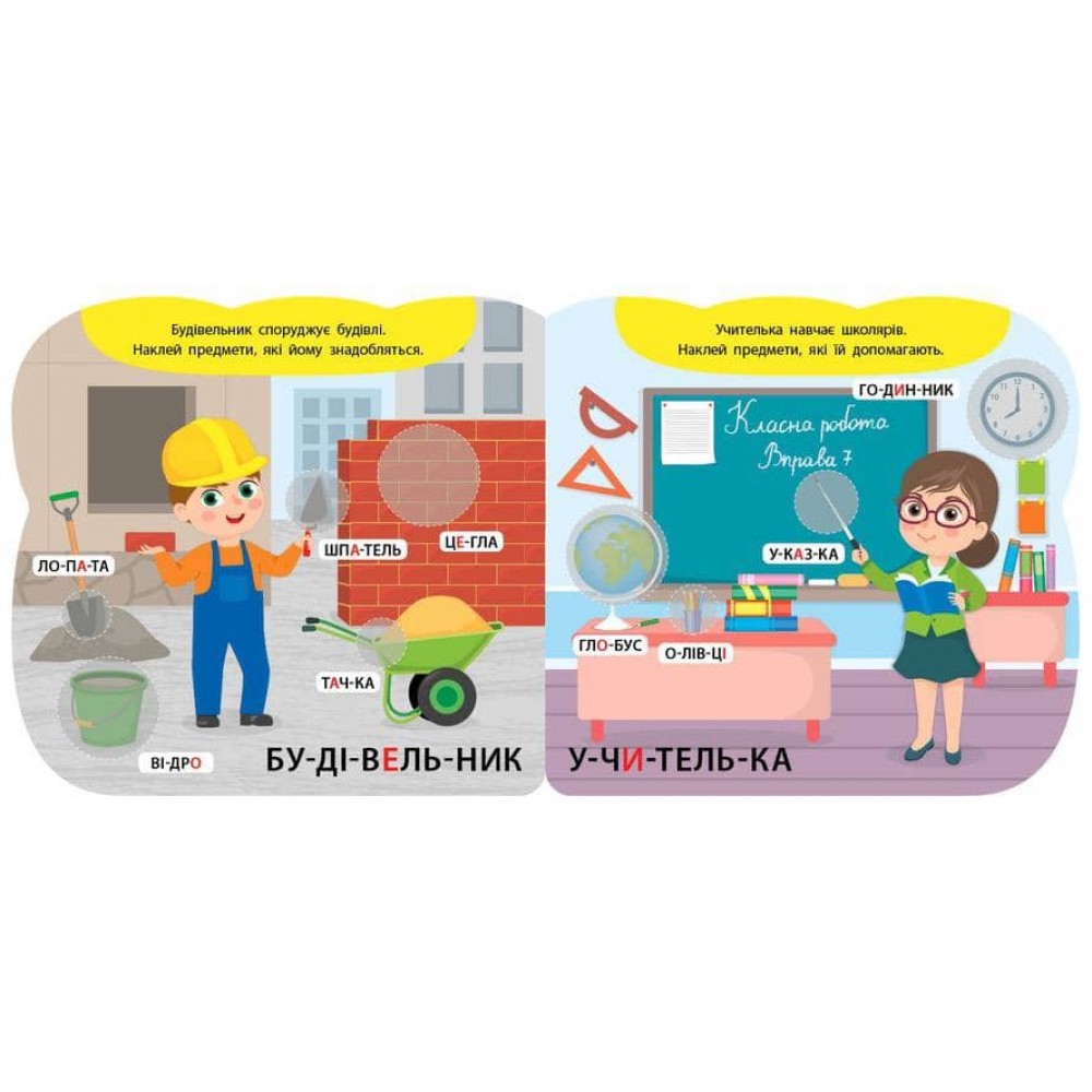 Ця книжка допоможе малюкам краще познайомитися з професіями. На її сторінках містяться малюнки людей, які потрібно доповнити наліпками з атрибутами їхніх професій. Місця для них спеціально виділені, щоб малюку було легше орієнтуватися на сторінці. Також малята зможуть прочитати по складах свої перші слова, що сприятиме розвитку їхнього мовлення та цікавішій роботі з книжкою. Видання призначене для спільної роботи дорослих з дітьми від чотирьох років.