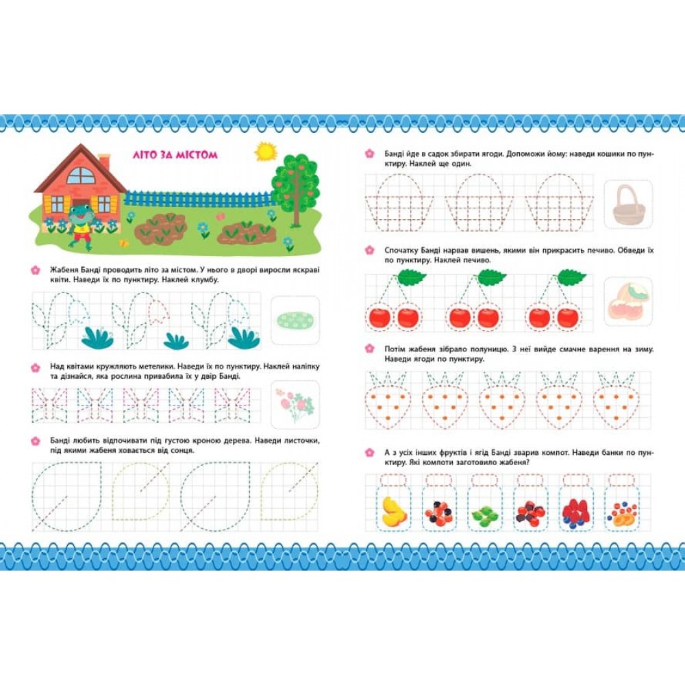 Це видання допоможе дитині швидко й легко пробудити та підтримати інтерес до письма, адже створене з урахуванням психології дитини. Прописи складаються із захопливих історій про пригоди тварин, які потрібно доповнити різноманітними лініями, фігурами й наліпками, а також навести по пунктиру та розфарбувати окремі предмети. Таким чином малюк стане активним учасником цікавої гри, захопливих пригод і неймовірних подорожей, а також розвине графічні навички, мислення та мовлення. Видання призначене для спільної роботи дорослих з дітьми від трьох років.