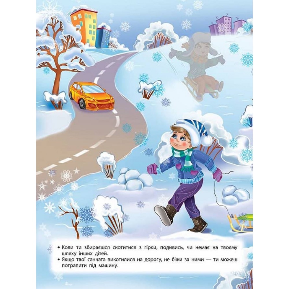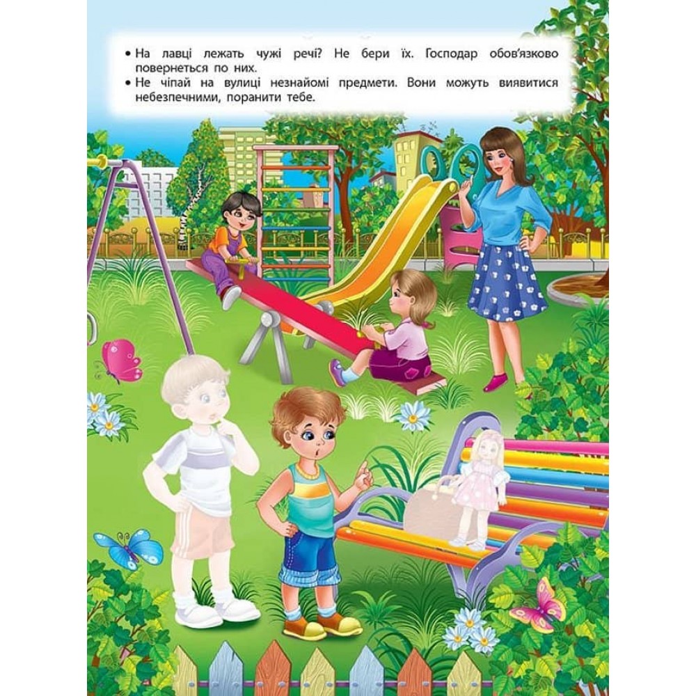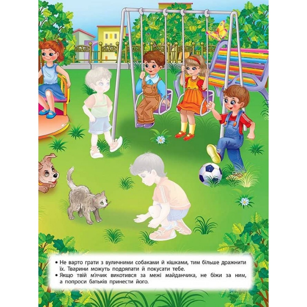 Завдяки цій книжці малюк швидко вивчить правила безпеки на вулиці. Він дізнається, як слід поводитися на дитячому майданчику, до кого звертатися по допомогу, якщо загубився, чому не можна розмовляти з незнайомцями, як уникнути небезпеки біля водойми, у лісі чи граючись зі снігом. Легко запам’ятати ці правила та весело й цікаво провести час дитині допоможуть пізнавальні картинки й кольорові наліпки.