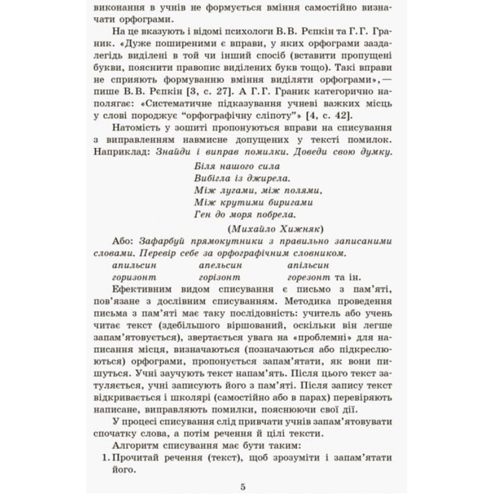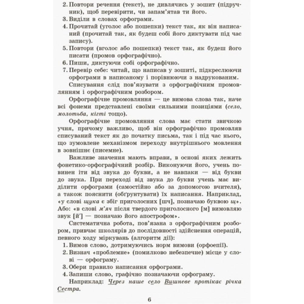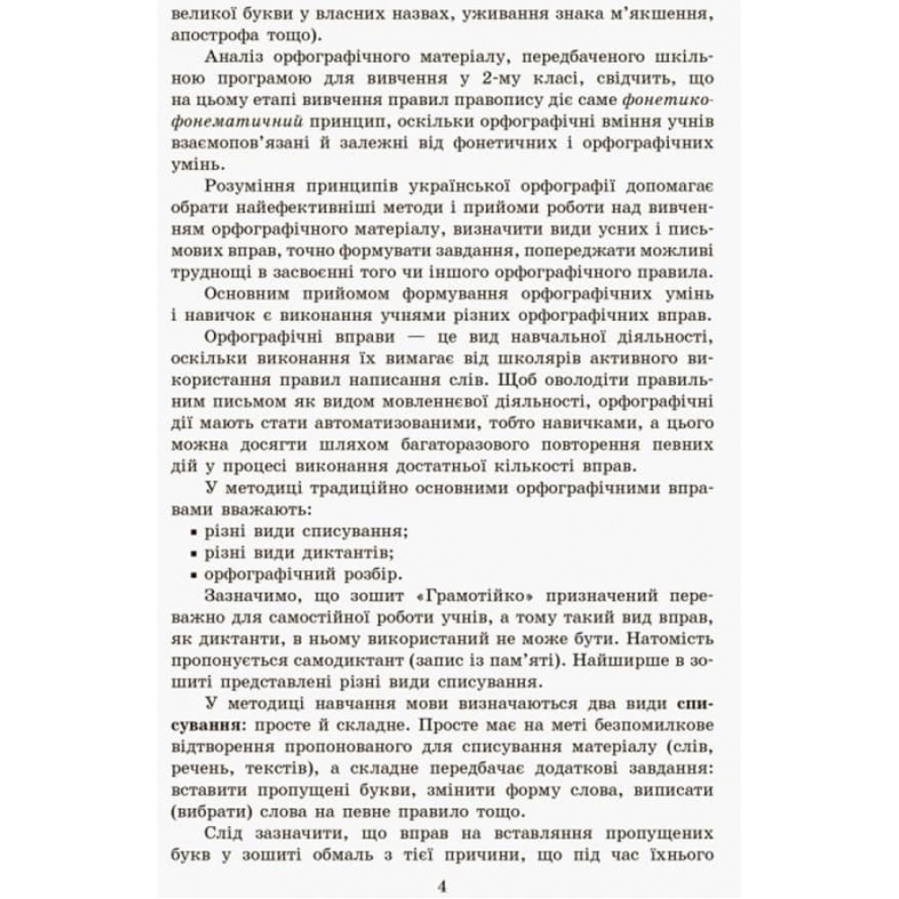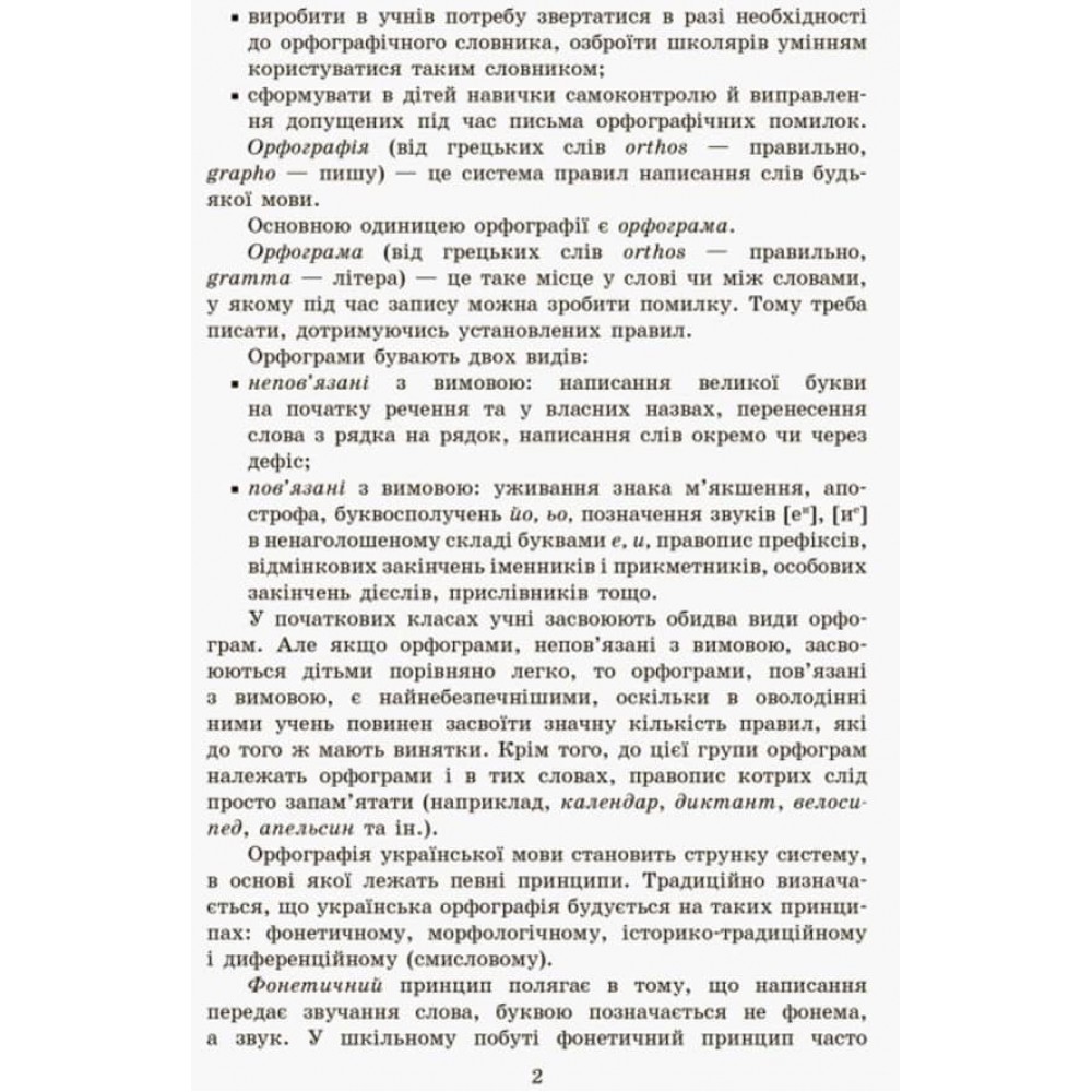 Автори пропонують різнотипні вправи і завдання, спрямовані на формування мовленнєвої компетенції учнів 2-го класу: уміння правильно записувати слова, вимова і написання яких не збігаються; позначати на письмі м’якість приголосних звуків; дотримуватися правил уживання великої літери на початку речення та у власних назвах, уживати розділові знаки під час списування й запису на слух речень.
