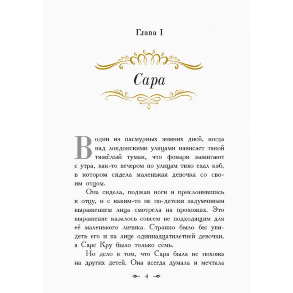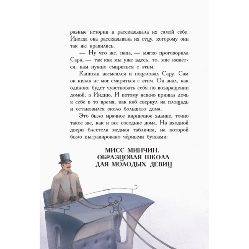 Сара Кру — семирічна дівчинка, яка сприймає світ як доросла людина. Улюблене заняття Сари — читати книжки і складати власні історії. Але жодні вподобання дівчинки не зрівняються з її любов’ю до батька — капітана Кру. Добра і сором’язлива Сара завжди вміла бачити людей наскрізь. Так, вона з першої зустрічі розпізнала в директорці школи, куди її влаштував батько, нещиру і жорстоку жінку. Своє справжнє обличчя директорка розкриває, щойно до школи приносять звістку про смерть батька Сари, яка залишається на неї без жодного пенса.