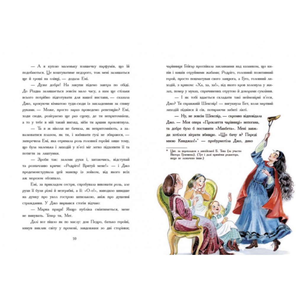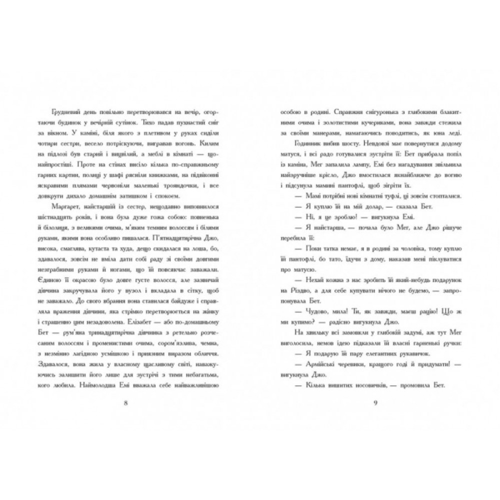 «Маленькі жінки» — відомий в усьому світі роман Луїзи Олкотт. За півтора століття після першого виходу у світ, він не втрачає актуальності, адже розповідає про базові людські цінності: турботу про близьких, працьовитість, прощення, вміння дружити. Харизматичні герої, ненав’язливі повчання й атмосфера позаминулого століття, в яку нас переносить письменниця, роблять читання роману захопливою пригодою.